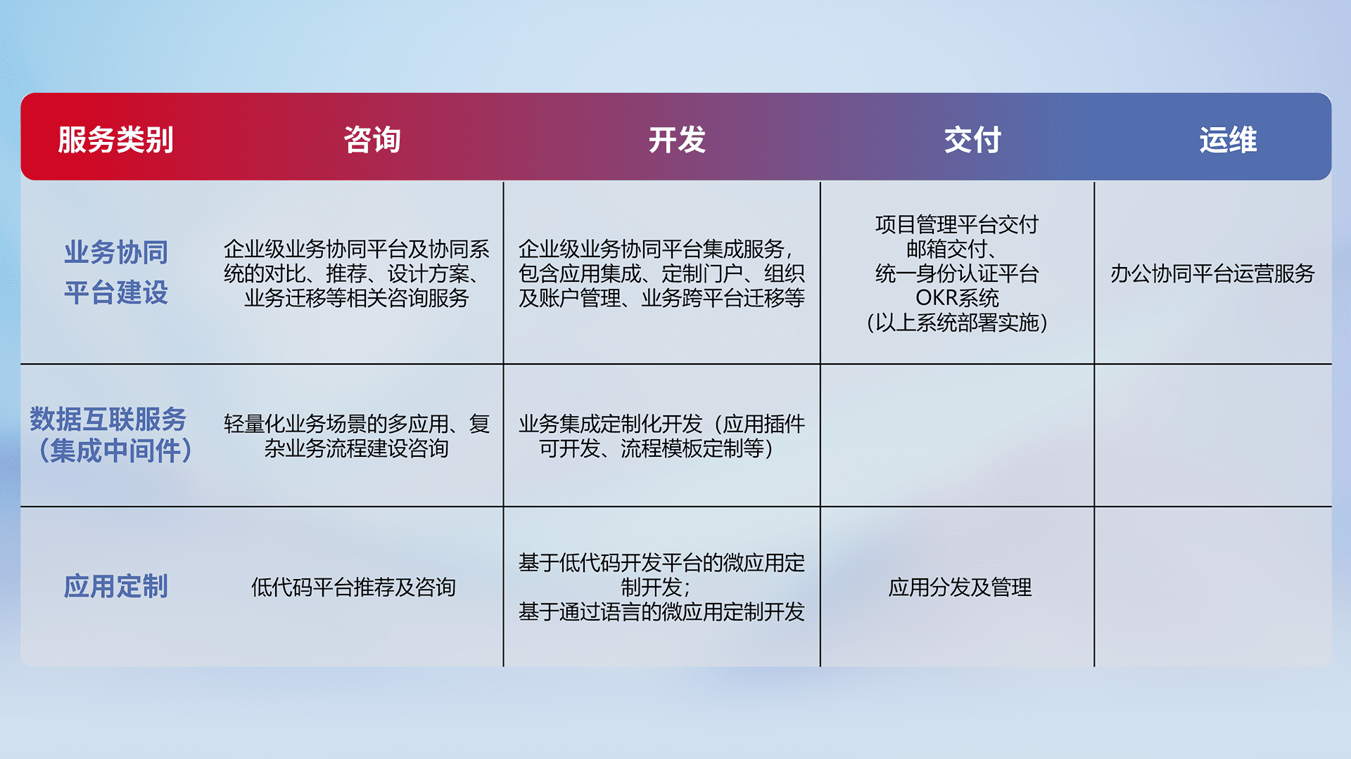 针对钉钉、、企微、、、IDaas等平台级产品提供产品的规划、、、、方案、、、、交付、、、、定制化开发等服务,,,实现如统一协同办公、、、智能客户服务、、、混合会议管理、、、、智能数据查询、、、等业务场景,,,,实现数字化转型。。